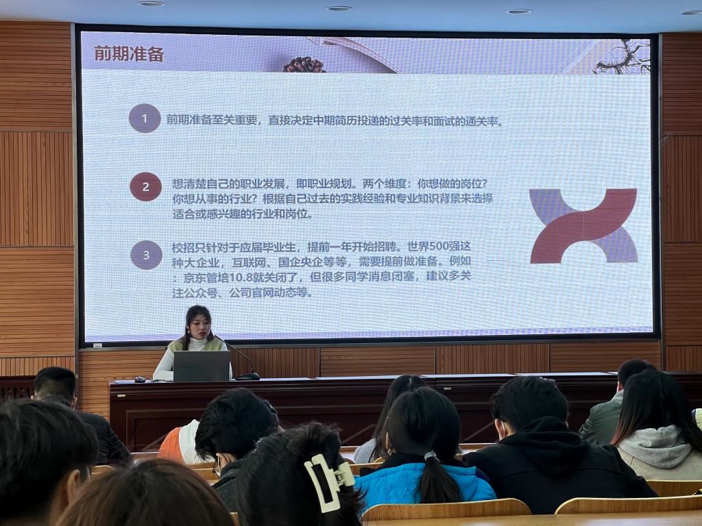 10月18日,学院在研楼363召开研究生就业经验分享暨培训会,邀请我校2021年新入职教师任哲仪和在京东实习的2021级研究生吴海风担任嘉宾。任哲仪对我院毕业生去往的单位性质进行分析,介绍了事业单位,科研单位的职业发展途径,提醒同学面对毕业季一定要尽早准备,努力备考;吴海风为大家讲解了简历制作要点及注意事项,并分享了面试的形式、具体流程以及应对策略。会后两位嘉宾为大家的疑问和困惑进行解答。