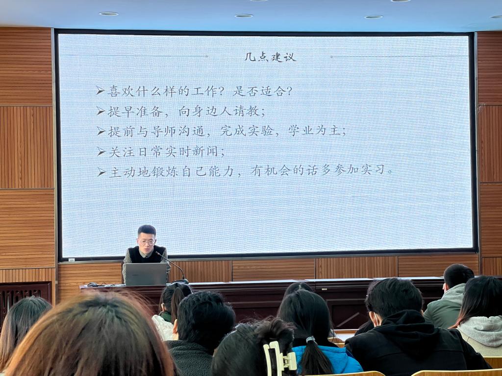 9月6日,研究生辅导员李水童向毕业生分析了学院近年来的就业升学情况及未来就业趋势,鼓励同学们拓展多渠道就业平台,指导毕业生从个人角度出发,正确认识自身情况,一方面提升自身职业素养,一方面做好职业生涯规划,同时结合大量过往毕业生就业实例,向大家分享了如何把握好时间节点,准备有针对性的就业材料以应对复杂的就业环境。