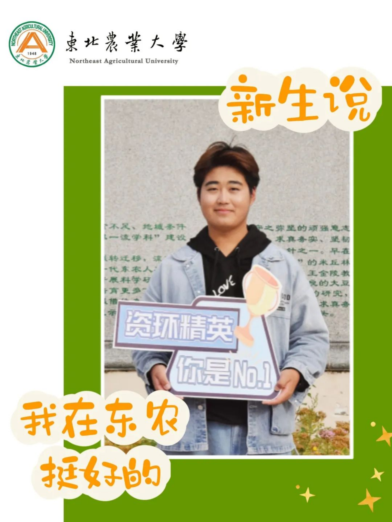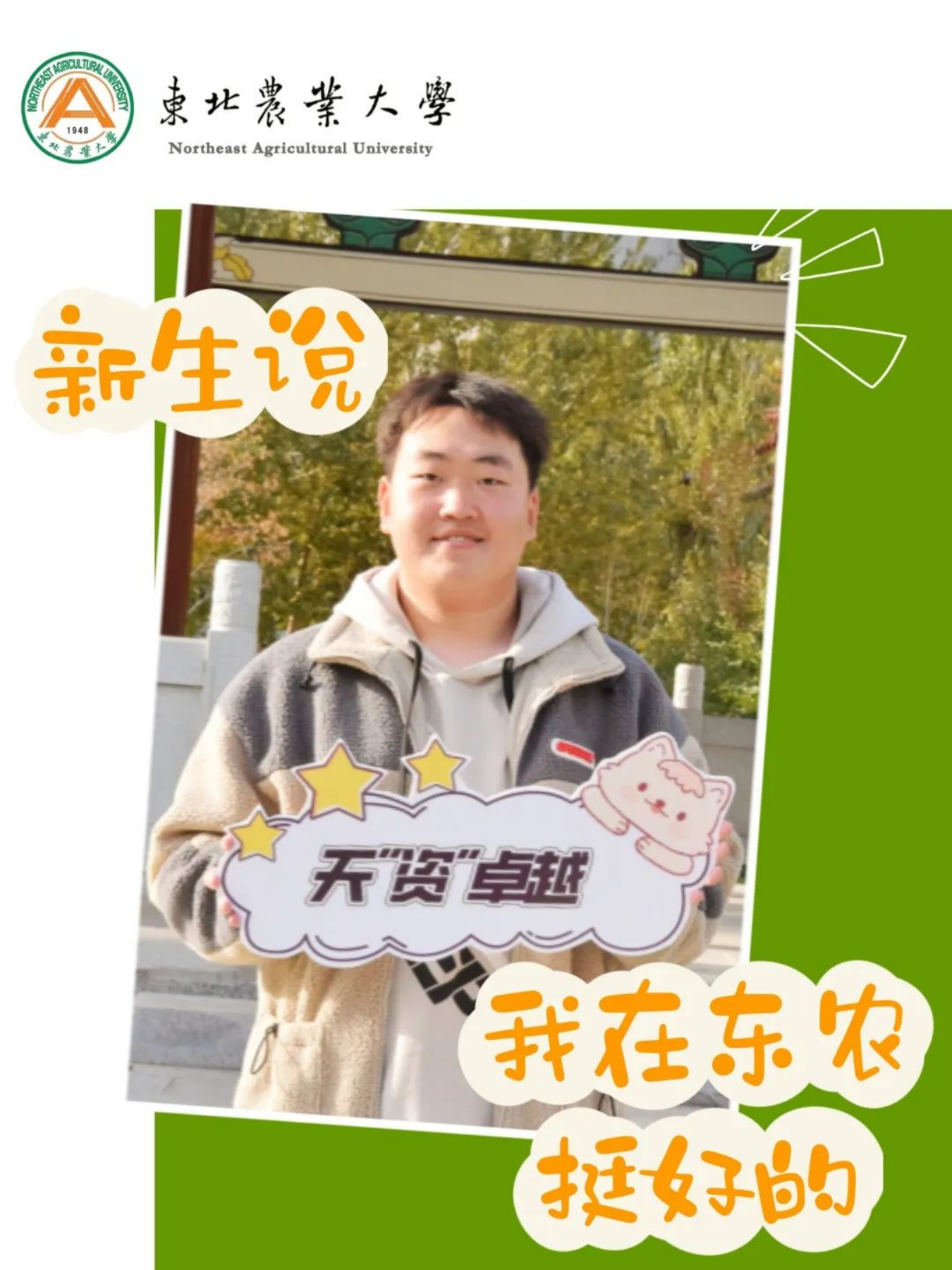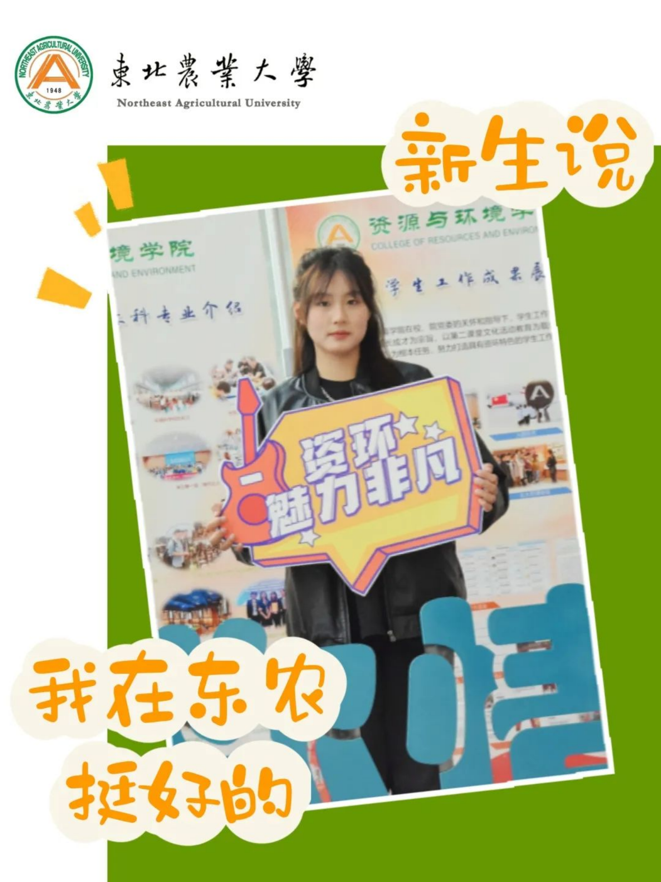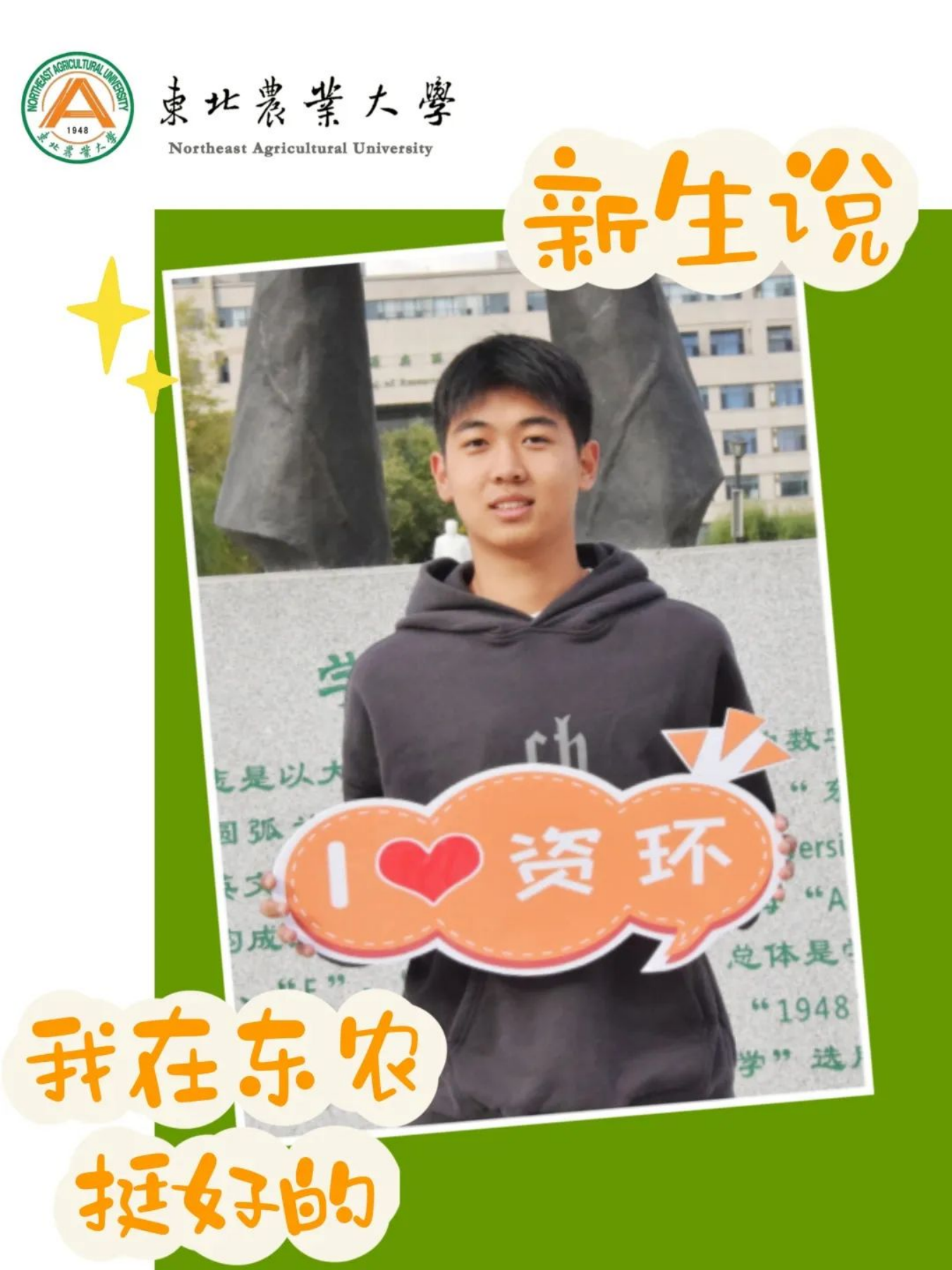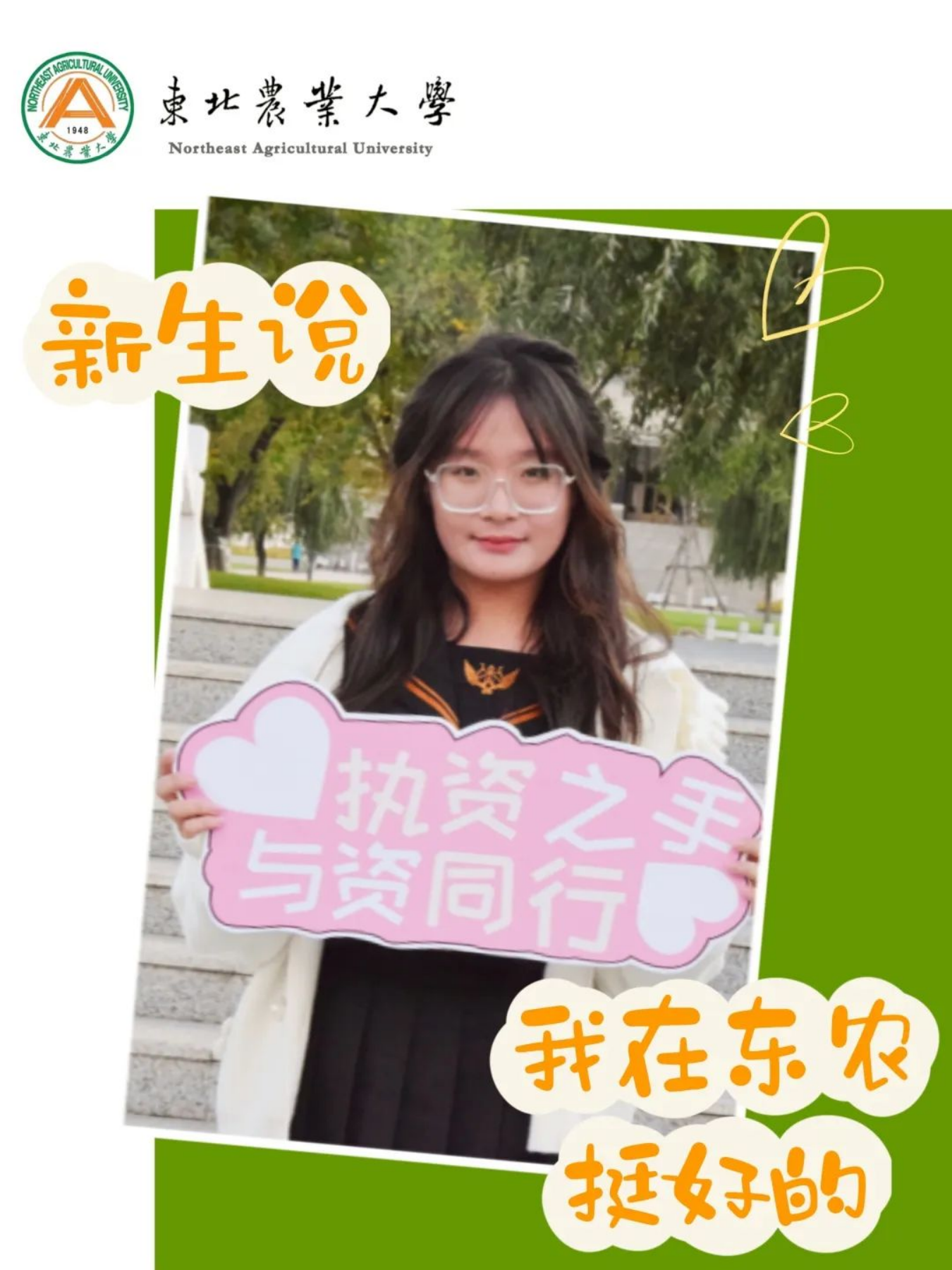 踏入东农的第一刻我就感受到了东农的热情。从进校开始到上宿舍楼一路都有志愿者跟随帮助。还有之后的游园活动,高年级的哥哥姐姐们热情的向我们介绍了校园整体景观从绿草茵茵的后稷园到位于中轴线上的主楼。从大名鼎鼎的饺子园再到我们的研楼都让我印象深刻。我的大学生活充实又开心,很开心加入东农资环院这个有爱的大家庭。