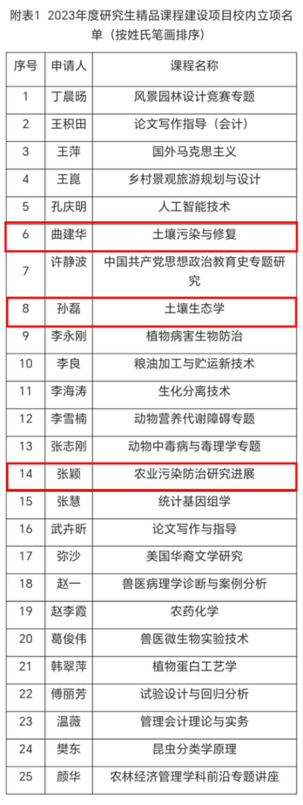 根据黑龙江省教育厅有关文件精神,学校组织开展了2023年度研究生精品课程建设项目推荐工作。我院张颖教授主讲的《农业污染防治研究进展》,曲建华教授主讲的《土壤污染与修复》,孙磊副教授主讲的《土壤生态学》获批校级研究生精品课程建设项目立项。