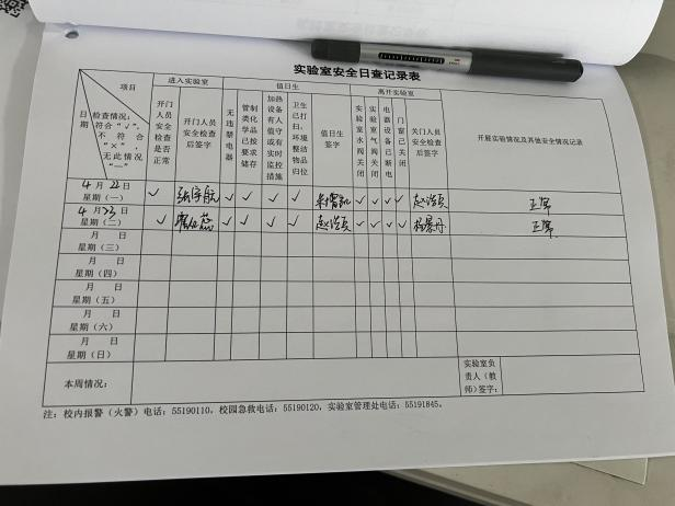 1.实验室安全日常记录本按要求未填写、导师未签字 |
