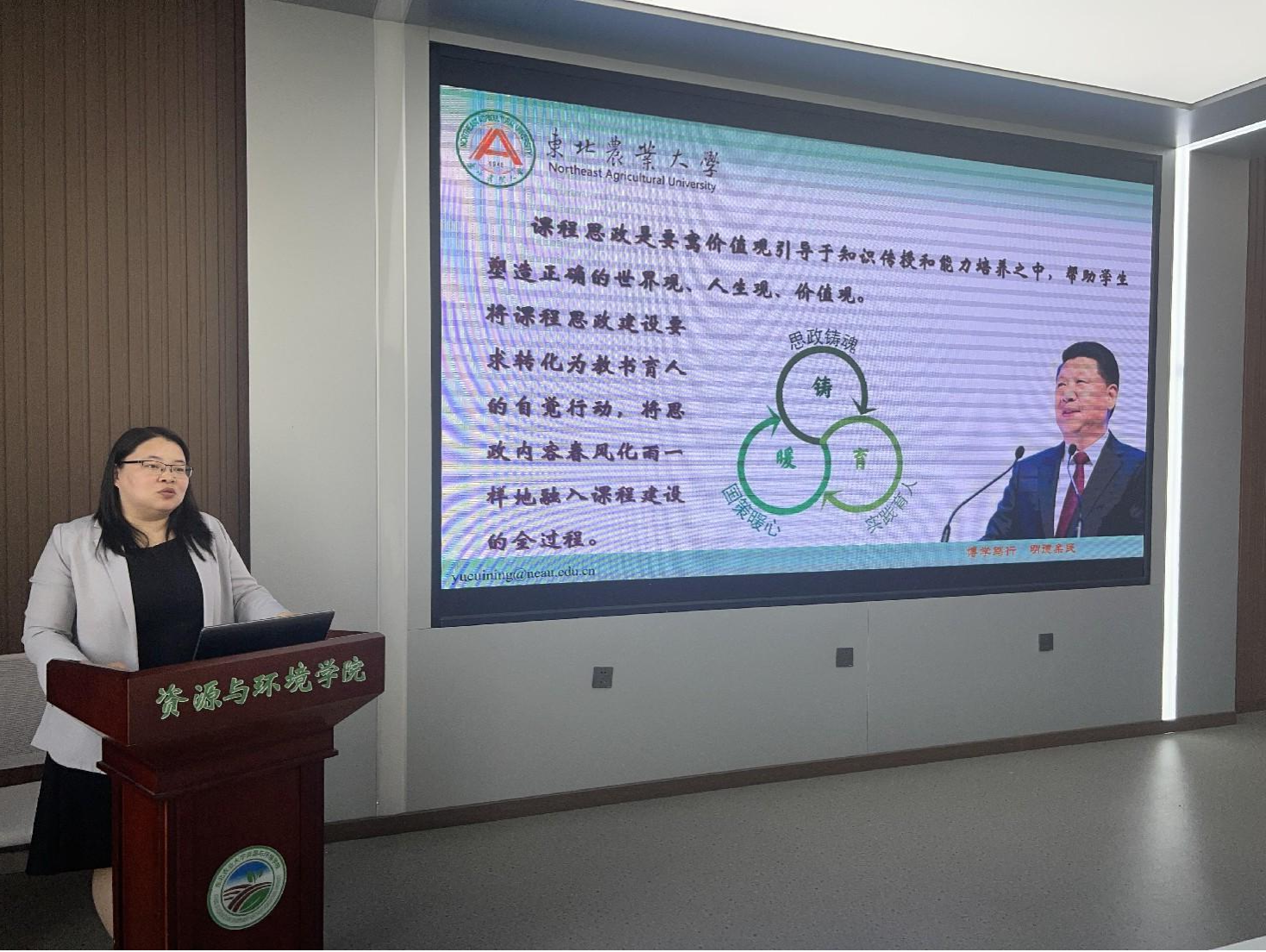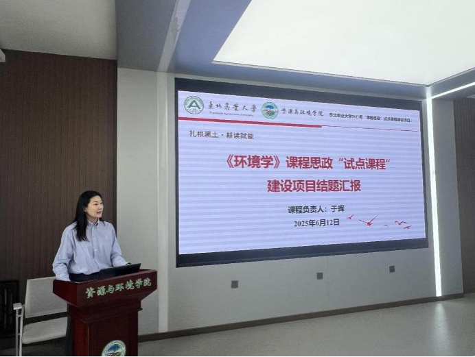 于晖以《扎根黑土*耕读赋能——<环境学>课程思政“十点课程”建设项目结题汇报》为题从建设背景、建设路径、特色案例、取得成效以及尚需解决的问题五个方面展开专题报告。《环境学》课程在授课过程中,确立了“扎根黑土·耕读赋能”的核心建设理念。构建了一个“知识-能力-情怀”三维协同的育人体系。这一体系不仅传授学生扎实的环境科学知识,培养他们解决实际环境问题的能力,更涵养学生深厚的家国情怀和责任担当。该课程以行业需求的技术能力为导向,以东北黑土地环境问题为牵引,紧扣行业对新农科复合型人才的需求,形成五维递进的教学思政创新模式。