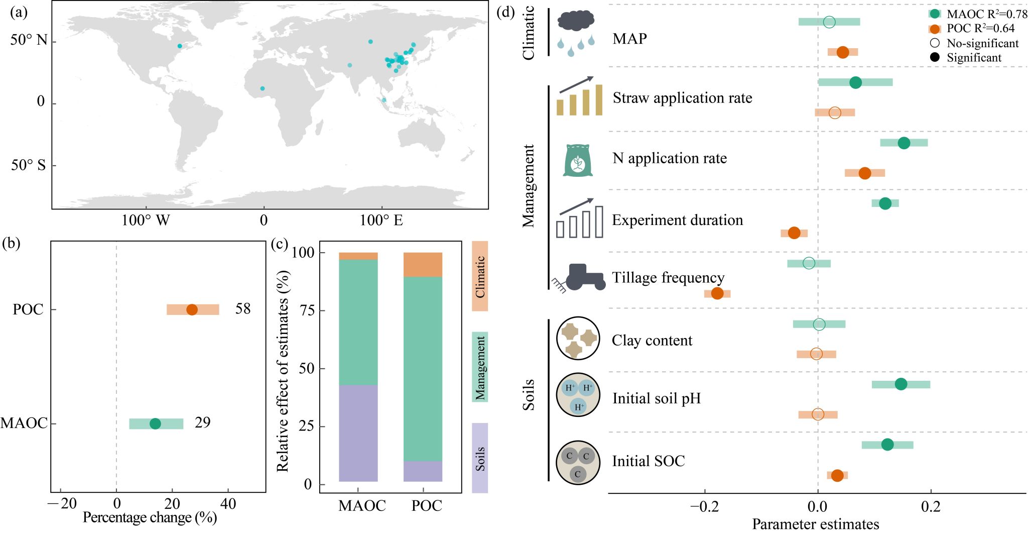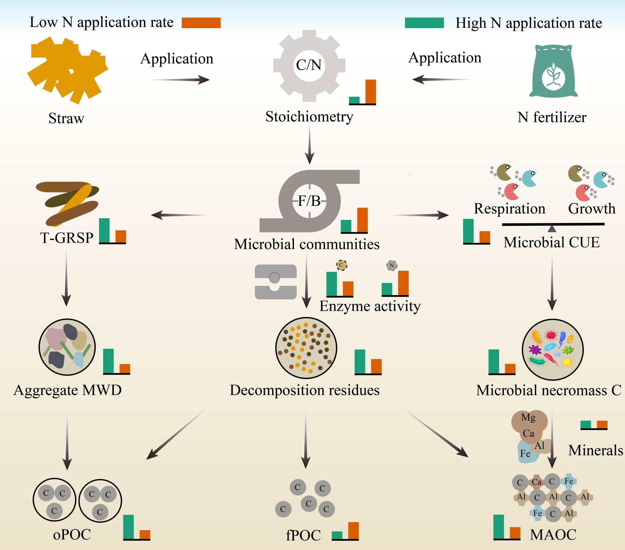 秸秆作为SOC的前体底物,可以通过复杂的生物和非生物过程转化为稳定的矿物结合态有机碳(MAOC)和不稳定的颗粒态有机碳(POC),从而促进SOC的积累。然而,它们对秸秆碎混还田的响应机制尚不清楚。为了解决这一问题,该研究采用Meta分析与田间试验相结合的方法,探讨了秸秆碎混还田对POC和MAOC的影响及其关键驱动因素。研究发现,秸秆还碎混田显著提高了POC(+18.0%)和MAOC(+13.9%)的含量,但其增幅受氮有效性的调控。具体而言,提高氮有效性可以缓解秸秆还田引起的碳氮比失衡,并增强与碳获取相关的酶活性,从而促进秸秆向SOC的转化。此外,在秸秆还田条件下,较高的氮素有效性还能促进土壤球囊霉素相关蛋白的生成,从而增大土壤团聚体的平均重量直径,进一步促进了闭蓄态POC的形成。该过程能有效隔离POC与微生物和酶的直接接触,最终有利于POC的稳定和长期积累。对于MAOC而言,在秸秆还田条件下,较高的氮素有效性能够刺激r-策略型微生物的生长,并提高微生物碳利用效率,从而增加微生物残体碳的产生,进而有利于MAOC的积累。该研究深化了我们对秸秆碎混还田增碳培肥机制的理解,也为未来加强黑土地保护与利用奠定了理论基础。