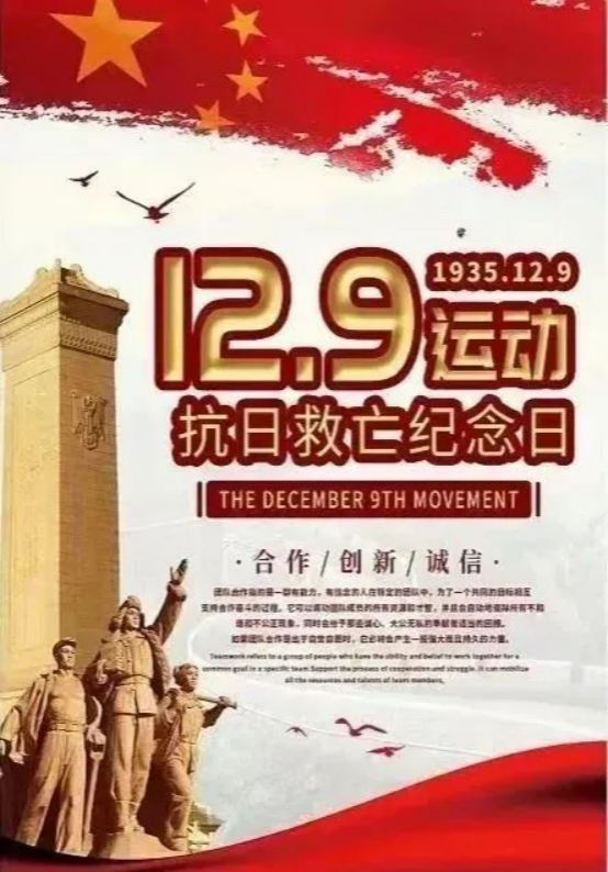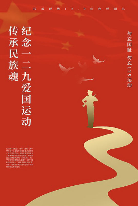 正如毛泽东同志所指出的,一二·九运动是动员全民族抗战的运动!而我们作为新时代的青年大学生,也要用自己的方式来缅怀先辈,传承他们心忧天下的精神,用铿锵有力的海报缅怀历史,以坚定不移的信念展望未来!