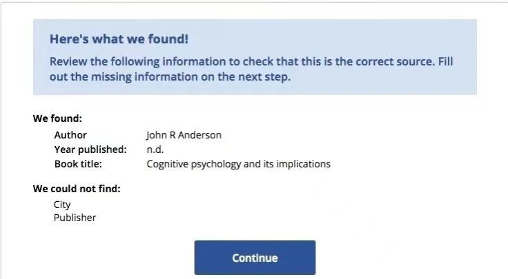 检索结果第一个就是,点击“cite”引用。确认是自己想要找的文献,点击“continue” 。然后可以选择复制到参考文献列表,或者复制到论文内。这样所需格式的参考文献就会自动生成啦!