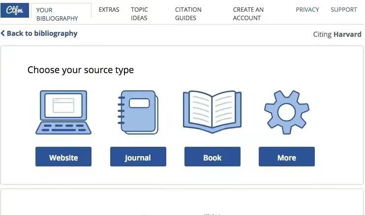 比如需要Harvard格式的文献,点击Harvard,下面会有网站,期刊,书籍及其他的参考文献类型供大家选择。