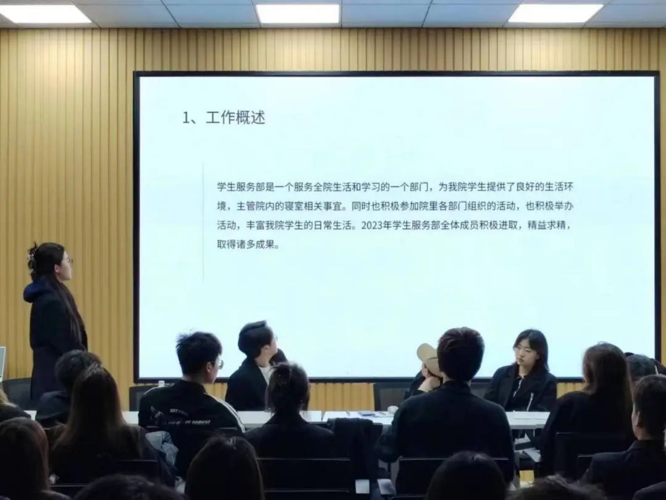 在本学期,学生会秉承着服务同学,开展了各项工作。学业发展部每周进行锁屏注学和晚自习并统计各班的出勤率,进行学风建设,同时也举办了“学业时光轴”设计大赛等活动,同学的参与度和配合度也高。学生服务部本学期每周三进行寝室卫生评比活动,并且举办了寝室文化节,冰雪系列等活动。监察调研部主要负责早操的检查,会在每天早上带领全院跑步锻炼身体,各位负责人准时出现,认真负责。
