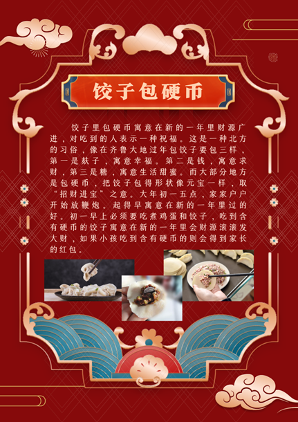 饺子是春节不可缺少的节目食品,究其原因:一是饺子形如元宝。人们在春节吃饺子取“招财进宝”之音,二是饺子有馅,便于人们把各种吉祥的东西包到馅里,以寄托人们对新的一年的祈望。首先的寓意是幸福,其次是财源滚滚,然后是甜蜜。目前很多地方都会在饺子里面放硬币,这么多人群之中,吃到硬币的那个人,在新的一年里面能够发财。对于劳动者来说,在新的一年中会有美好祈愿。愿大家龙年行大运,好运连连来。愿在新的一年里;如龙入海,财源滚滚。身体健康,笑口常开,阖家欢乐,万事胜意!龙年新春,祥瑞满溢。愿如龙腾飞,事业兴旺;如龙舞动,身体康健。