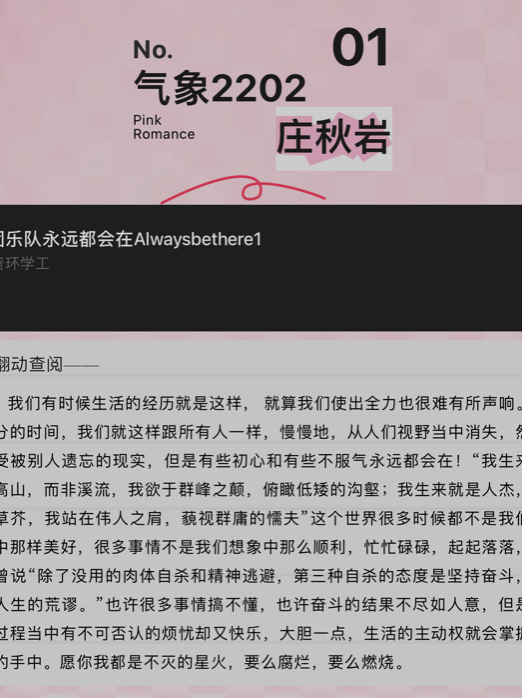 步步青春自丈量,许许不易何人知?当无处安放的好奇与不期而遇的迷茫撞了满怀,只愿你能舀坚持之活泉,溉希望之壤。以往之不谏,来者之可追。请相信,如果生活把你抛入最低谷,也一定给你留了上坡的路。