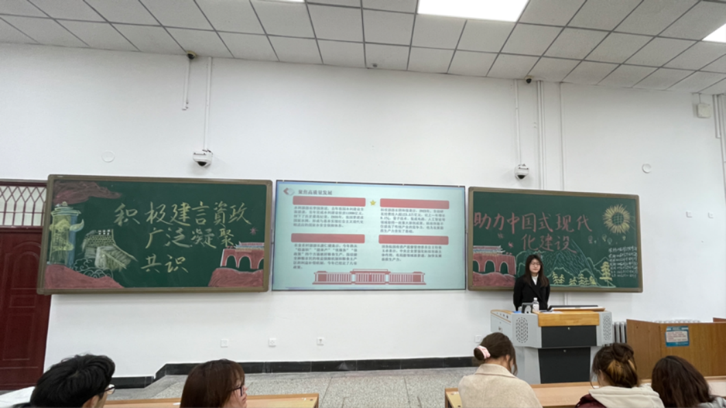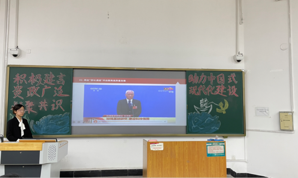 环境、气象及农资的主讲人准备充分细致,通过播放“两会”期间的视频,让同学们更好地了解到“积极建言资政”意味着要积极参与政治生活,为国家和社会的发展贡献自己的智慧和力量。这包括提出建设性的意见和建议,推动政府制定更加科学合理的政策,促进国家治理体系的完善和发展。通过建言资政,我们可以表达自己的观点和诉求,同时还可以增强我们的社会责任感和使命感等。