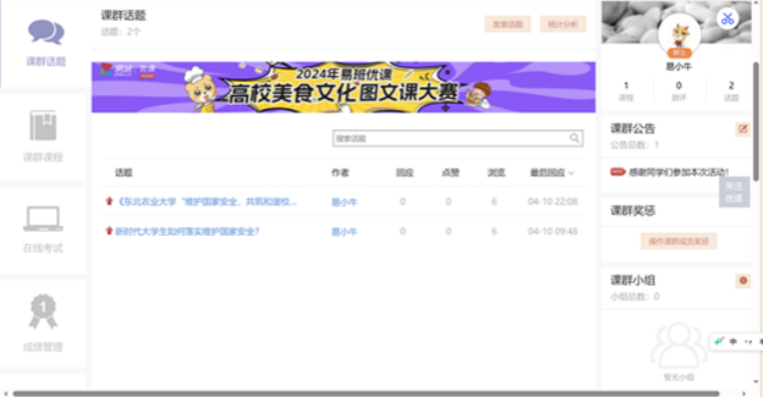 首先是我们的课群话题,在课群话题讨论区发帖或回帖大于等于五条,此模块成绩即可记为满分。
