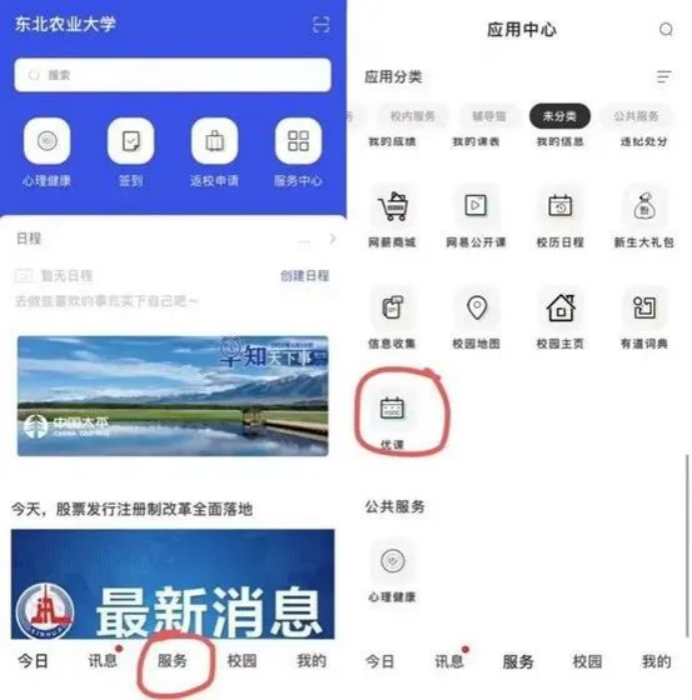 ①打开“今日校园”点击服务