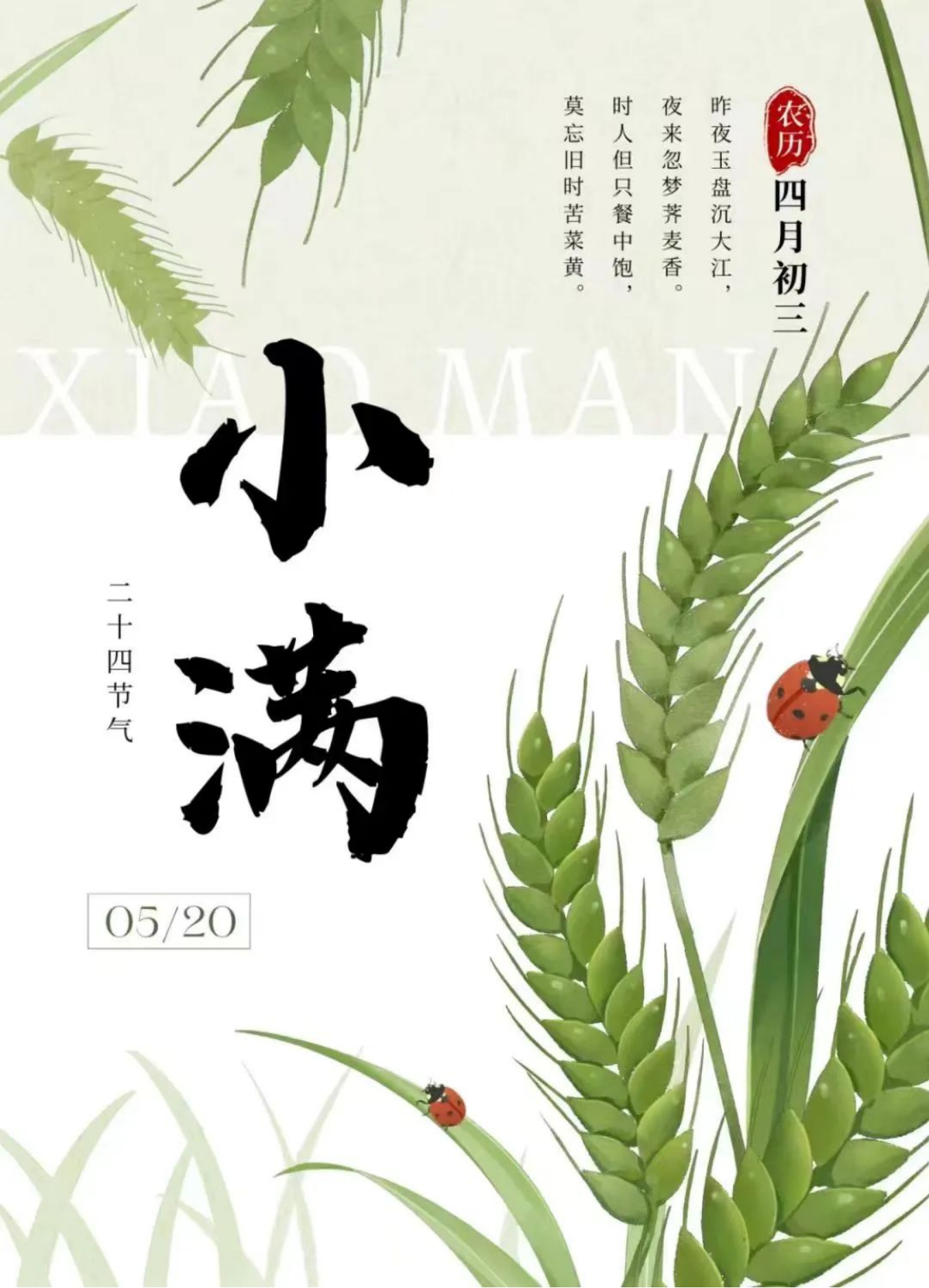 小满,二十四节气中的第八个节气,也是夏季的第二个节气,于每年公历5月20—22日交节。小满节气民俗根据农耕社会特点形成,节气民俗主要有“小满祭车神”、“小满动三车(水车、油车和丝车)”、“小满抢水”、“小满祈蚕节”、“小满食野菜”等。