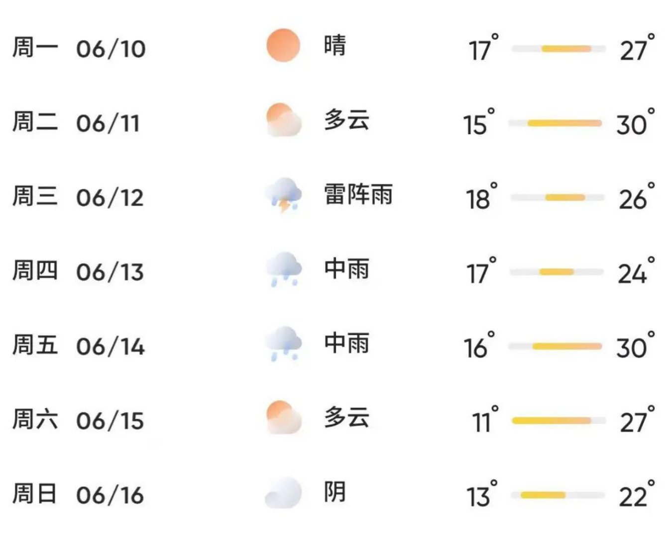 6月12日(周三)和6月13日(周四)的天气将再次转为雷阵雨,气温将维持在18℃至28℃和15℃至 28℃之间。西南风3级将吹拂,湿度分别为69%和67%。请继续随身携带雨具,并注意安全,避免在雷雨时外出。在宿舍中,可以通过追喜欢的剧或读一本好书等方式,过上愉快的下午。