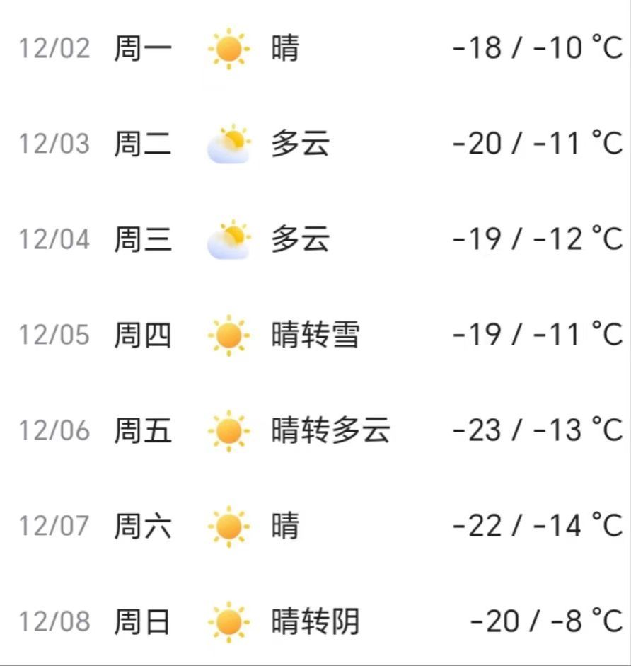 未来一周天气状况较为单一,天气主要以晴为主。最低气温降至-23℃,最高气温只有-8℃。