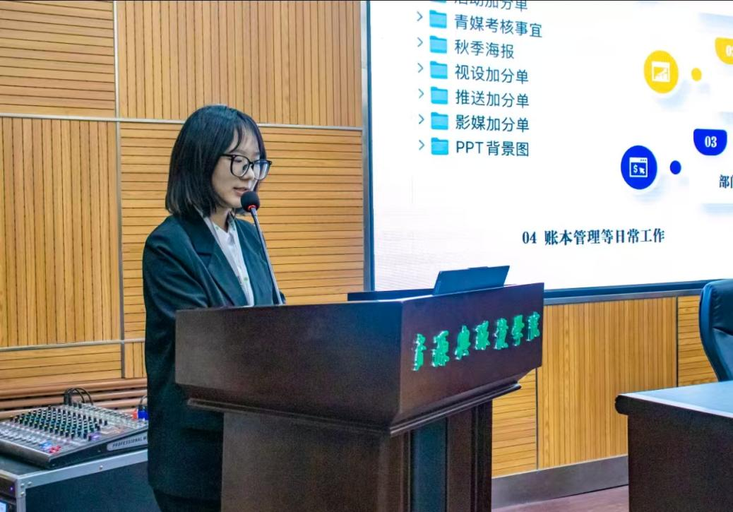 会议中,影像传媒部部长王俞睿、新媒体运营部部长蒋庆涛、新闻采编部部长刘雨姗、视觉设计部部长要骁姗、综合事务部部长徐紫涵依次进行部门工作总结与未来规划,也对本学期工作尚存的问题与不足进行了总结,提出了有效改进措施。本学期新增“耕梦拾影”、“青媒倾音”两个常驻模块,各部门配合良好,完成预期目标。