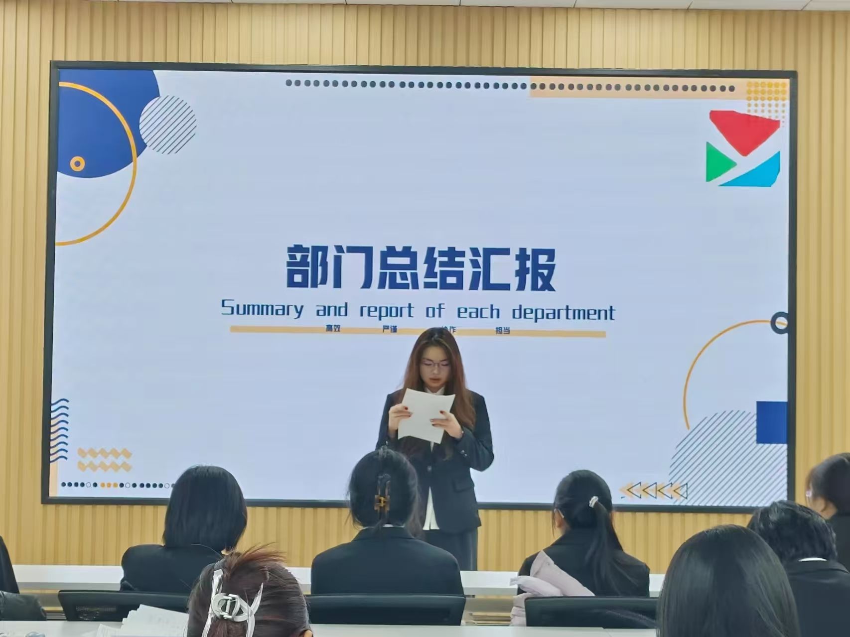 宣传部副部长庞茜对本学期工作进行总结。宣传部开设“吟芳华之韵,沐墨林之风”英语口语及写作活动三期,同学们抒发爱国热情的同时发扬了中华优秀传统文化;“耕读重读志,拾词写成诗”诗创活动两期,活动受到众多学生好评。宣传部将提升推送质量,设计更多兴趣内容,大大提升宣传力度,做到精益求精,不断积极推进第二课堂活动。
