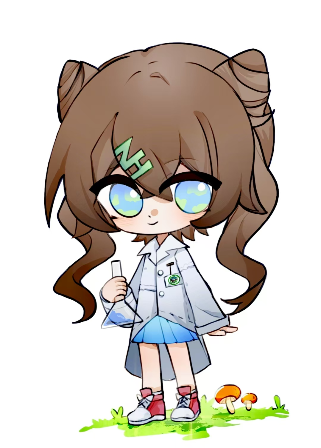 身穿带有院徽的实验服、手拿锥形瓶表达资环师生求知探索精神,发型取自“牛”的形象代表着刻苦奋斗,在发饰上采用了资环学院的缩写“ZH”字样,眼睛采用地球形状、增添蘑菇有资源保护之意,整个外观设计上体现活泼开朗的性格。