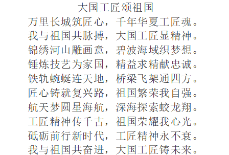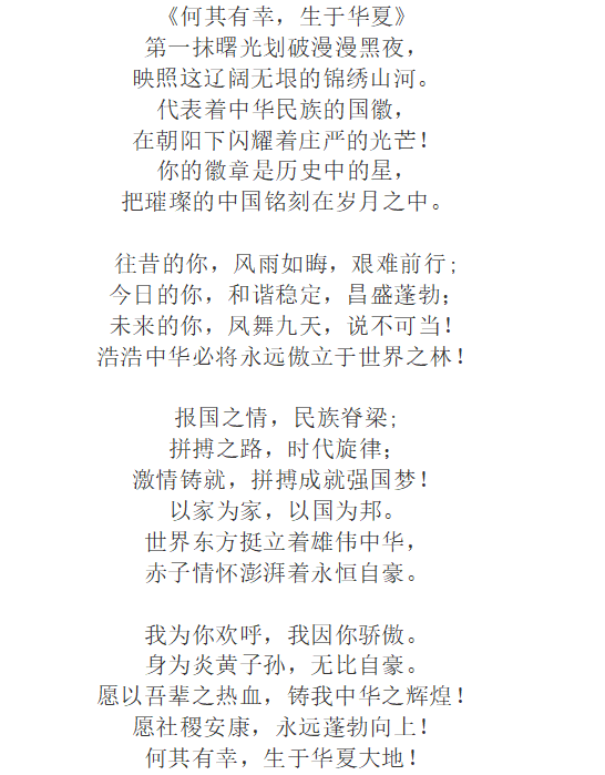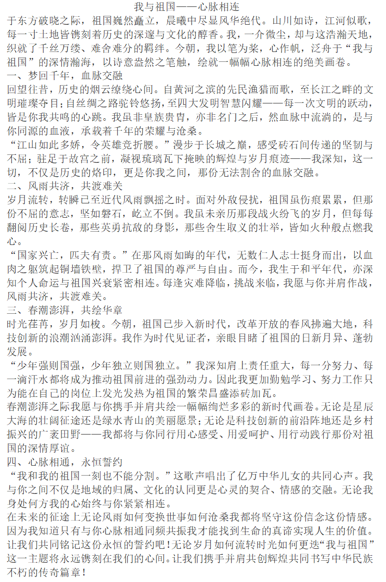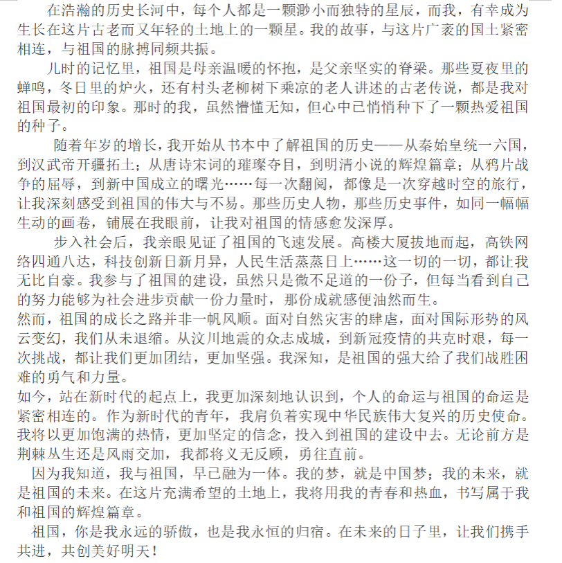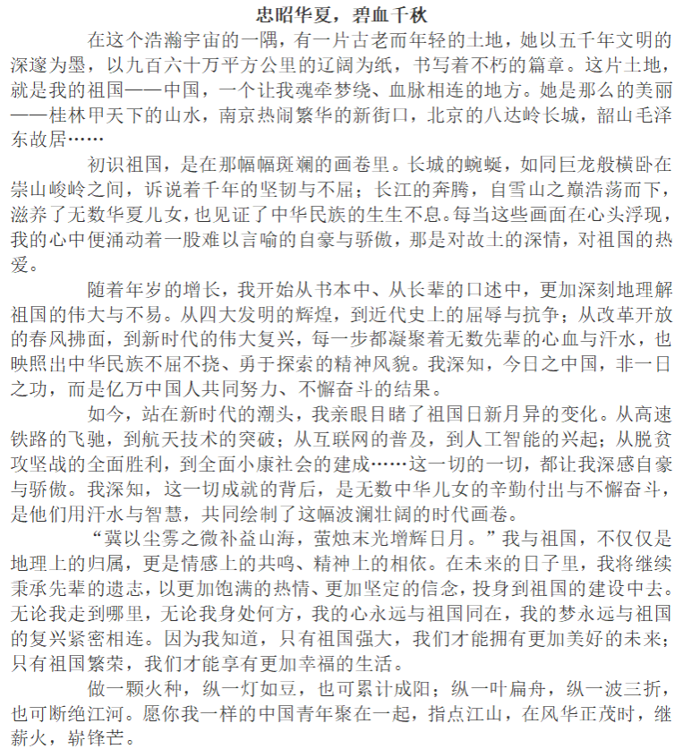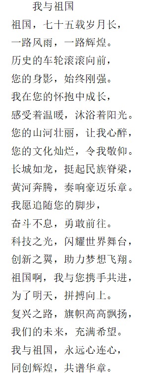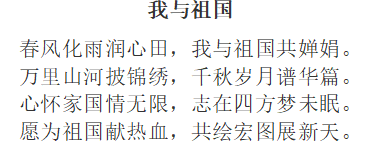 弘扬爱国主义精神,激发青春担当。本次山河披锦绣,盛世写华章2024国庆主题朗诵与创作比赛在同学们的积极参与下圆满结束!百年风云激荡走过壮阔征程,百年不懈奋斗铸就世纪伟业,百年上下求索作出伟大贡献。本次活动,同学们积极参与,深深展示了同学们的爱国情怀,经过评比,最终获奖名单及作品如下。