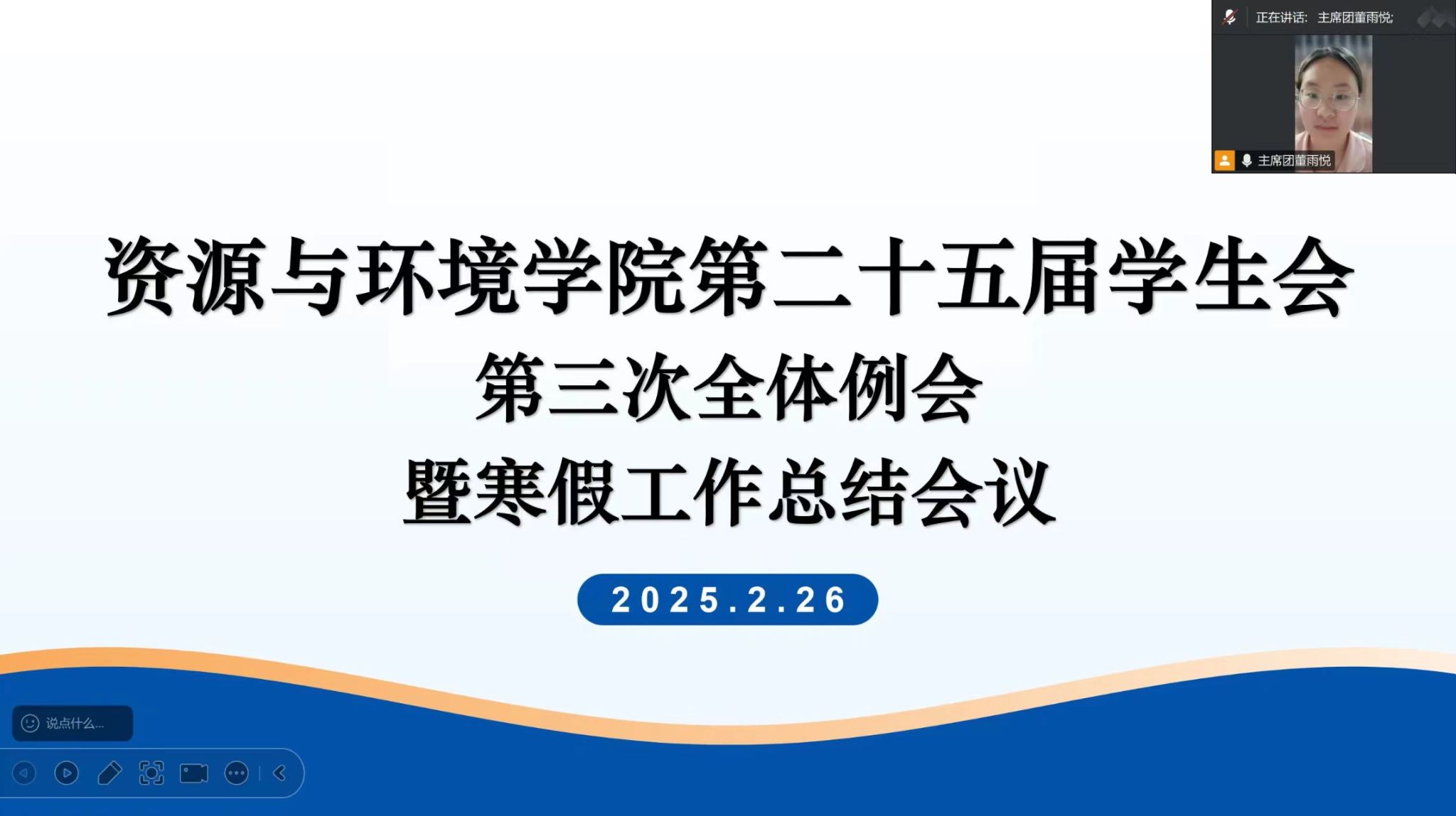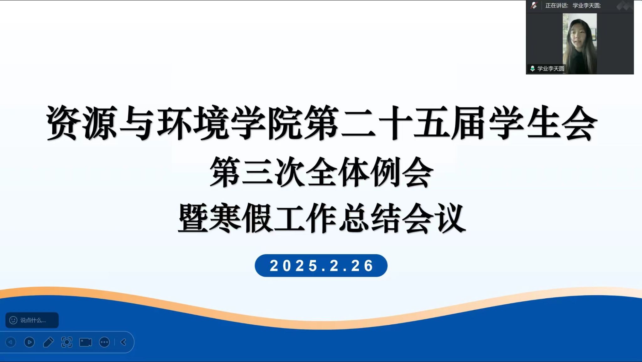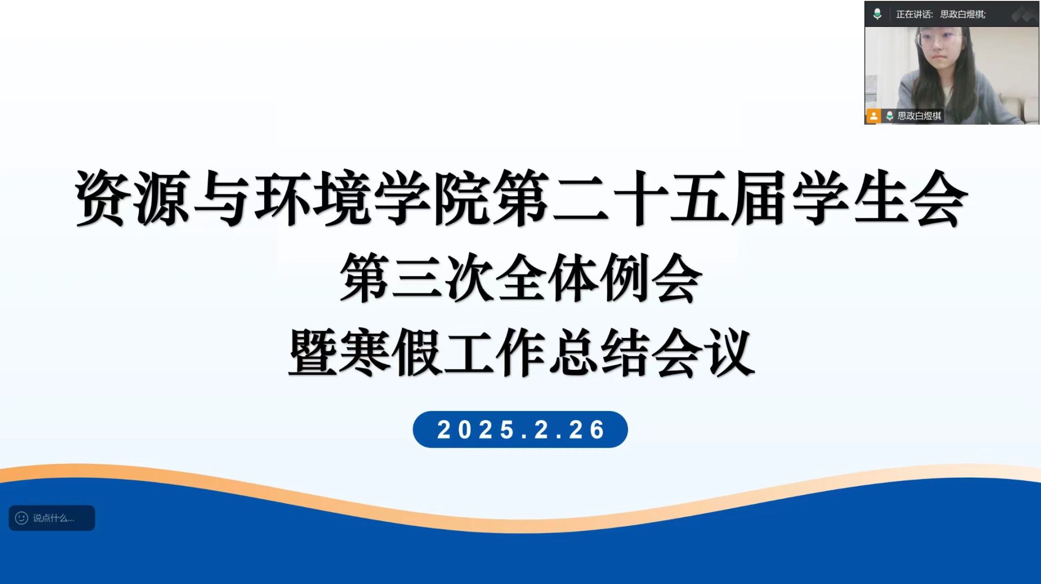 董雨悦主席表示,学生会圆满的完成了本学期的工作。临近新学期,为了迎接新学期,希望各部门积极策划活动,加强部门之间的联络。在寒假,学生会陆续推出了一系列活动,使同学在寒假期间体会到了不一样的假期。同时,学生会将加强与各学院、社团的合作与交流,共同打造丰富多彩的校园文化氛围。