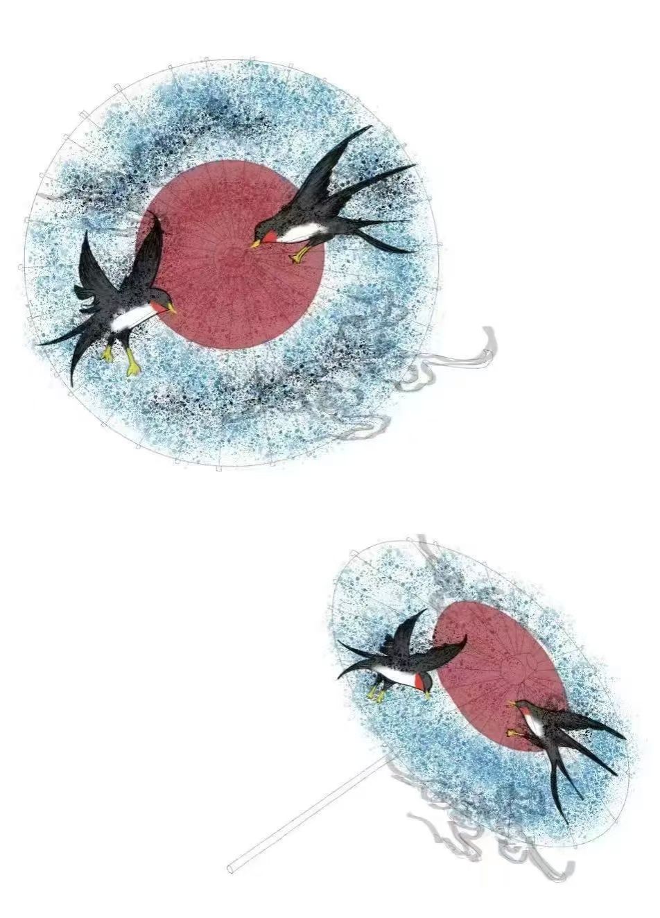 该油纸伞设计主要以浅蓝色为背景,加入灵动燕子、盛放花朵,整个画面清新协调,尽显中式美学。燕子衔春,传递生机希望;繁花绽放,寓意生命蓬勃。花鸟相融,勾勒自然之美,既蕴传统韵味,又借物抒情,寄寓美好愿景,予人视觉与精神双重愉悦。