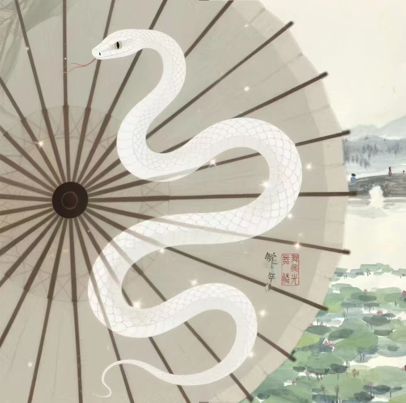 烟雨濛濛,撑开这柄油纸伞,白蛇盘于其上,似从悠远传说中蜿蜒而来。那闪烁的鳞片微光,如岁月遗落的星芒,于水墨湖光山色间,舞动出独属于蛇年的鳞光。