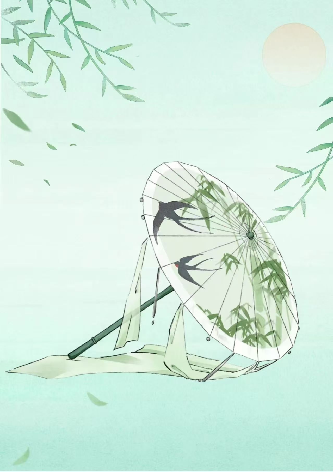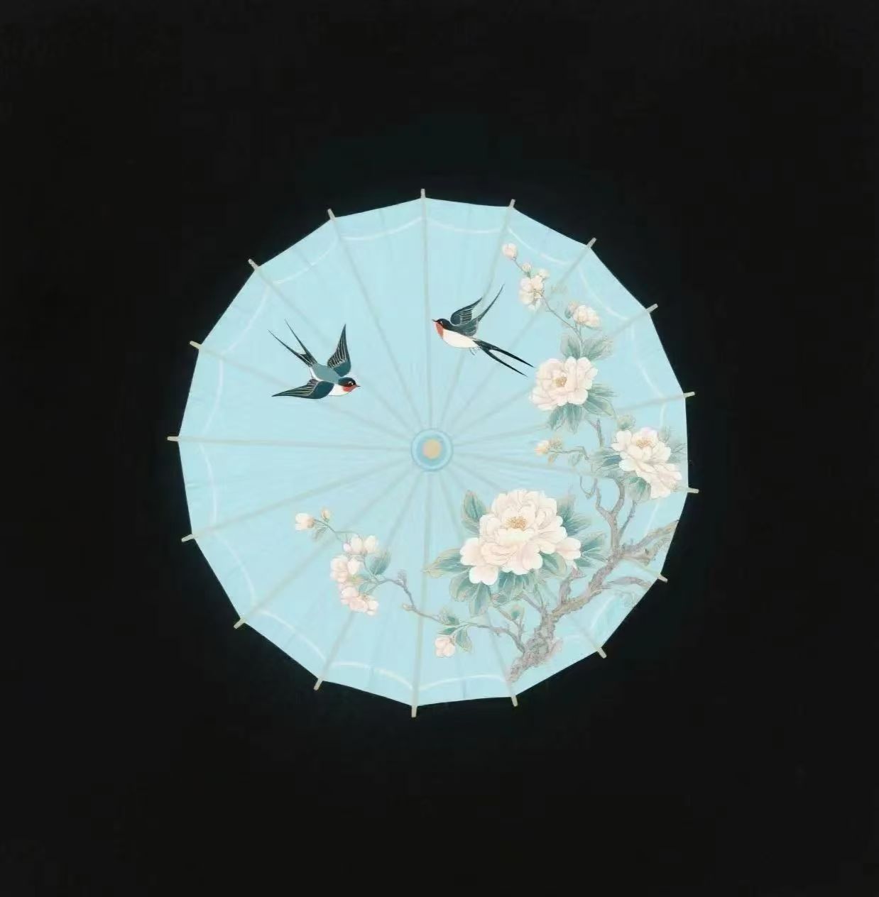 伞面上绘有花朵和飞鸟,象征着自然之美和文化情感。设计简洁而优雅,展现了东方文化中的经典元素,传递出一种宁静和谐的氛围。