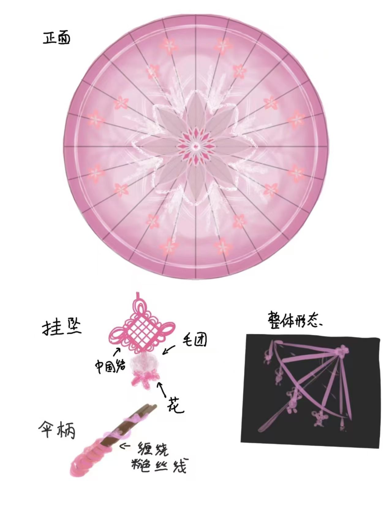 该作品伞面采用轻薄半透明的绢布,大朵樱花图案,由中心向四周晕染开,边缘点缀小巧的梅花刺绣,增添精致感。伞柄缠绕粉色丝线,丝线末端系上小巧的粉色琉璃珠。中国结为挂坠,搭配毛团状粉色流苏,中间嵌入粉色花瓣形状的干花标本,增添自然气息。挂坠:以中国结为主体,用粉色丝线编织,搭配毛团状粉色流苏,中间嵌入粉色花瓣形状的干花标本,增添自然气息。该作品融合了传统与柔美,以粉色为主色调,传递温婉浪漫的东方韵味,唤起人们对古典诗意生活的向往。