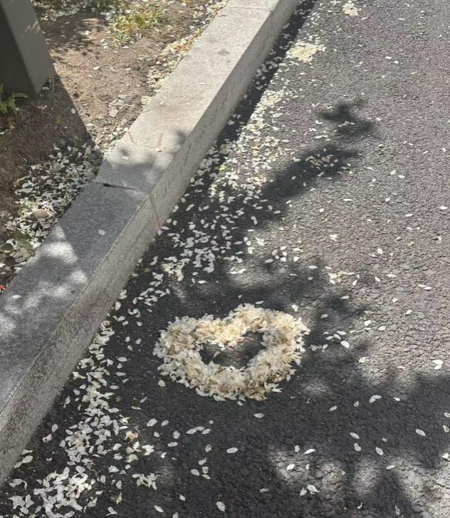 一条小路,路边散落着一些花瓣,阳光透过树叶洒在地面上,形成了斑驳的光影。在小路的中央,用花瓣摆出了一个心形图案,显得格外温馨和浪漫。