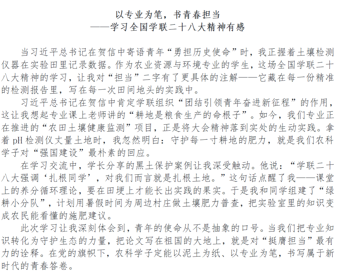 本次征文活动中,同学们的来稿紧扣主题,从不同角度阐述对学联二十八大精神的感悟。有的同学在文章里讲述学习习近平新时代中国特色社会主义思想的收获,坚定理想信念,筑牢信仰之基;有的结合自身经历,分享在社会实践、志愿服务中践行使命担当的故事,展现新时代青年的奉献精神;还有的探讨如何将个人成长与国家发展紧密相连,以实际行动为强国建设贡献力量 。这些文字,饱含着同学们对党和国家的热爱,对学联事业的关注,对自身成长的思考。