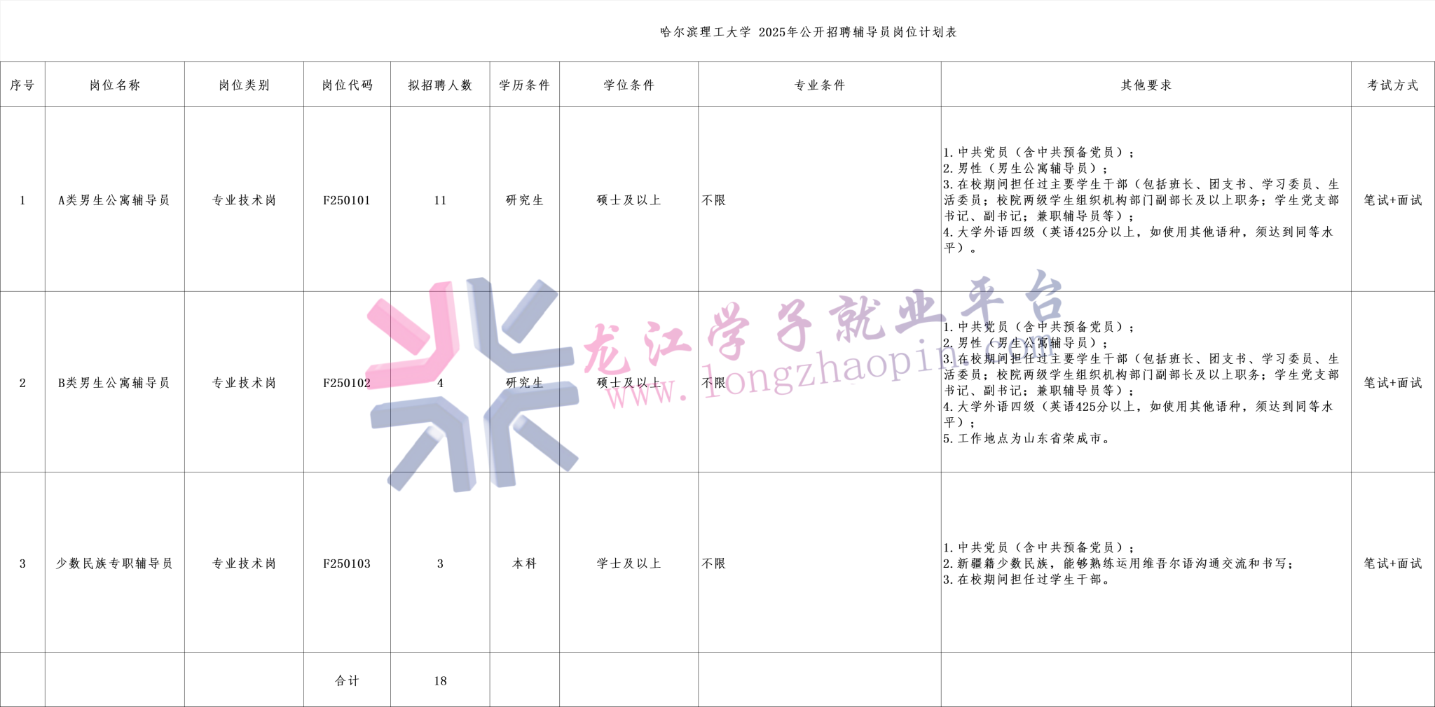 本次计划招聘专职辅导员18名。具体招聘岗位、人数、条件等详见《哈尔滨理工大学2025年公开招聘辅导员岗位计划表》(附件1,以下简称《计划表》)。