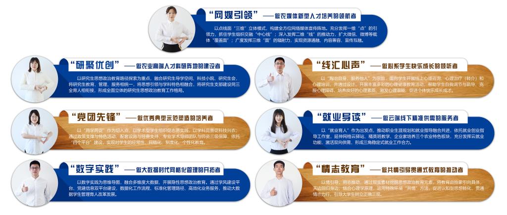 以数字实践、智慧育人为构架导向,分析融合多维度大数据,全力构建“隐性”思想政治教育。以信息化工作模式,标准化管理路径、精准化定向服务,高效化办事流程,全力推动数字化学生工作育人改革发展。通过标杆工程评选,开展数字化学风平台建设,“研—本”助推计划,打造信息共享党建平台等举措,受众群体达5600余人,切实增强育人实效,共有600余名学生获国家级、省市级科研奖项,8人保送至清华大学、北京大学、复旦大学、全寝成功上岸农业院校研究生。